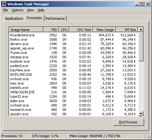 I really like the News & Blogs RSS aggregation feature in Thunderbird. Particularly how it loads the webpage instead of just the article summary. However, I think there may be a virtual memory leak. I have about 30 feeds that check for updates every 60 minutes. If I leave Thunderbird running for a few days, particularly over the weekend, the memory and virtual memory usage keeps adding up: